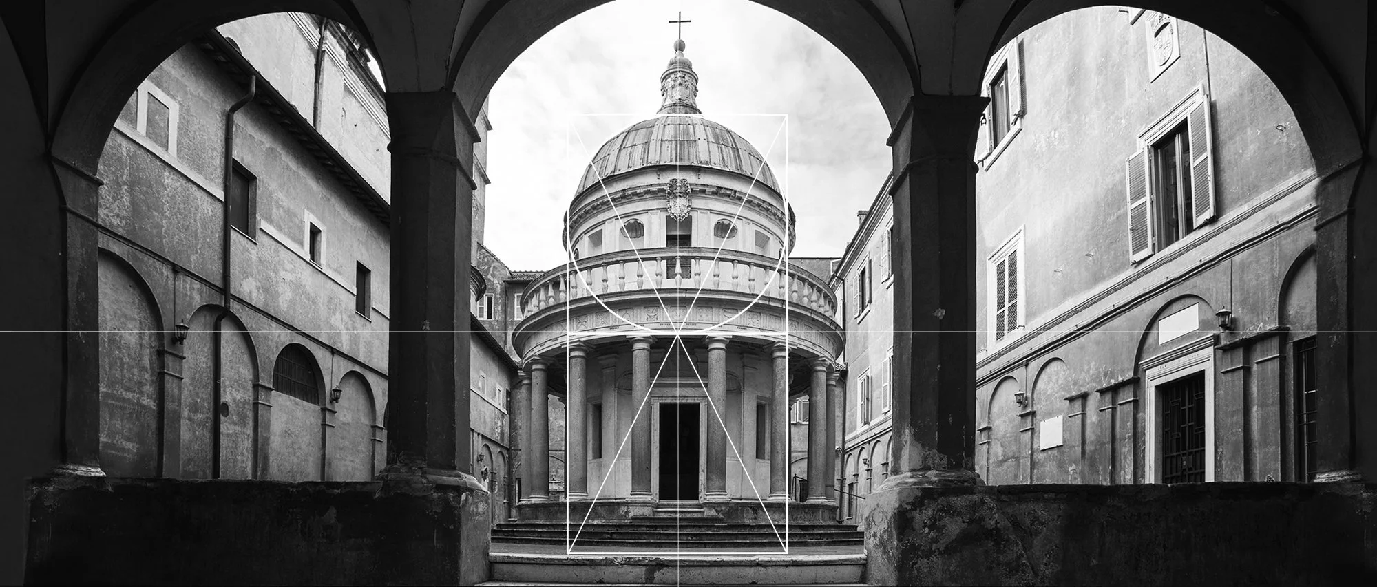 The sacred diagram is exemplified in Bramante’s Tempietto, a commemorative martyrium in the courtyard of The Church of San Pietro in Montorio in Rome, from approximately 1502. The Tempietto is perfectly circular in plan and the proportions of the dome in elevation hold both the sacred square and circle.